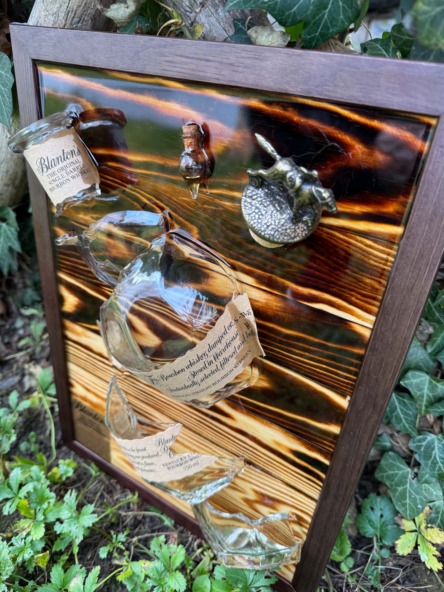 Handcrafted broken bottle design picture frame approx. 30×40 cm – Blanton's Single Barrel Bourbon encased in epoxy resin.