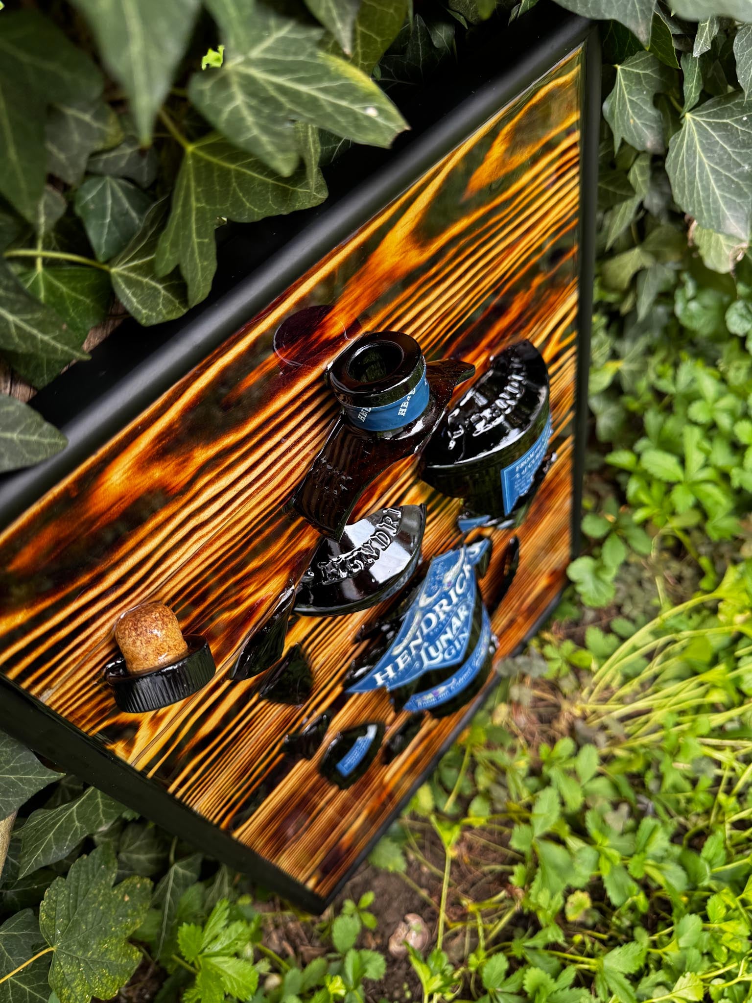 Handcrafted broken bottle design picture frame approx. 30×40 cm – Hendrick's Lunar Gin encased in epoxy resin.
