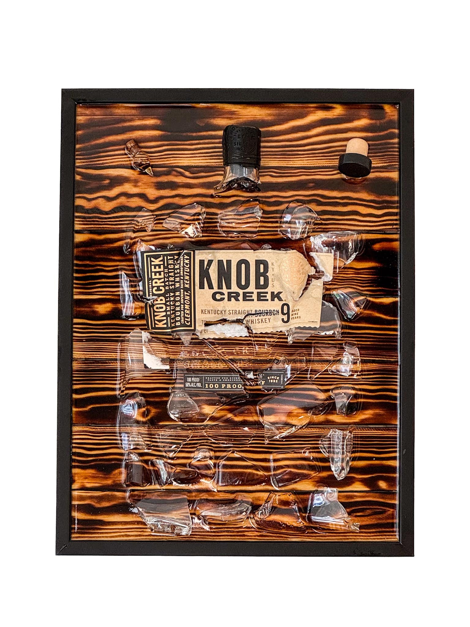 This exclusive picture frame combines premium design with authentic heritage. The shards of an original Knob Creek 9 year bottle have been artistically arranged and permanently sealed in clear epoxy resin – a handcrafted one-of-a-kind piece for lovers of fine spirits and exceptional decor.