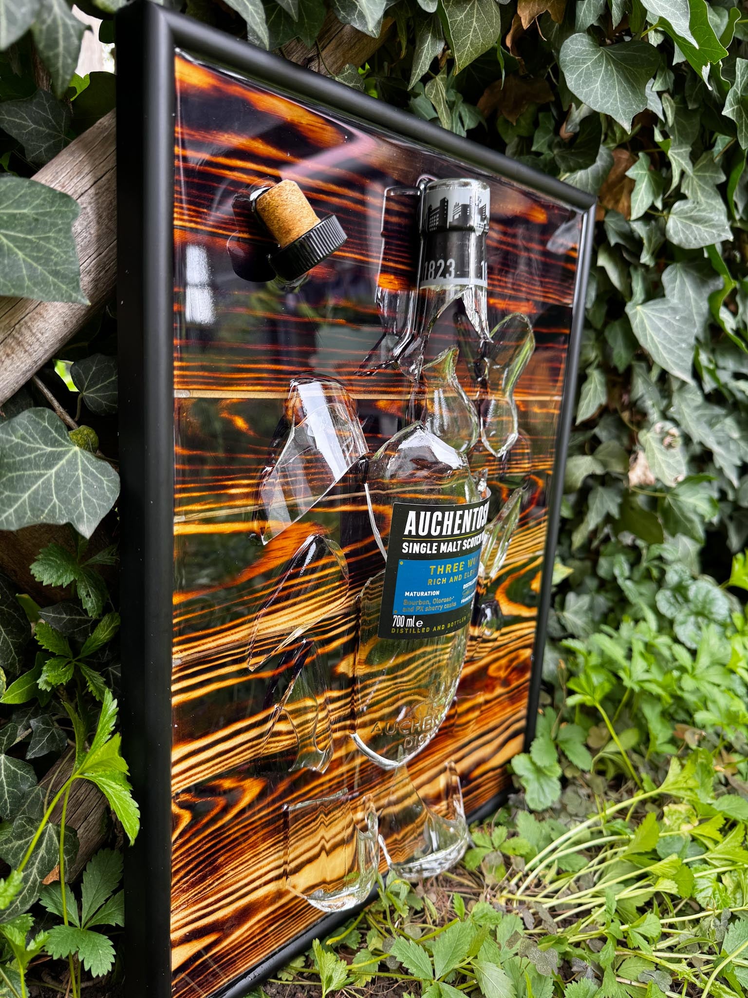 This exclusive 30×40 cm picture frame combines premium design with authentic heritage. The shards of an original Auchentoshan Three Wood bottle have been artistically arranged and permanently sealed in clear epoxy resin – a handcrafted one-of-a-kind piece for lovers of fine spirits and exceptional decor.