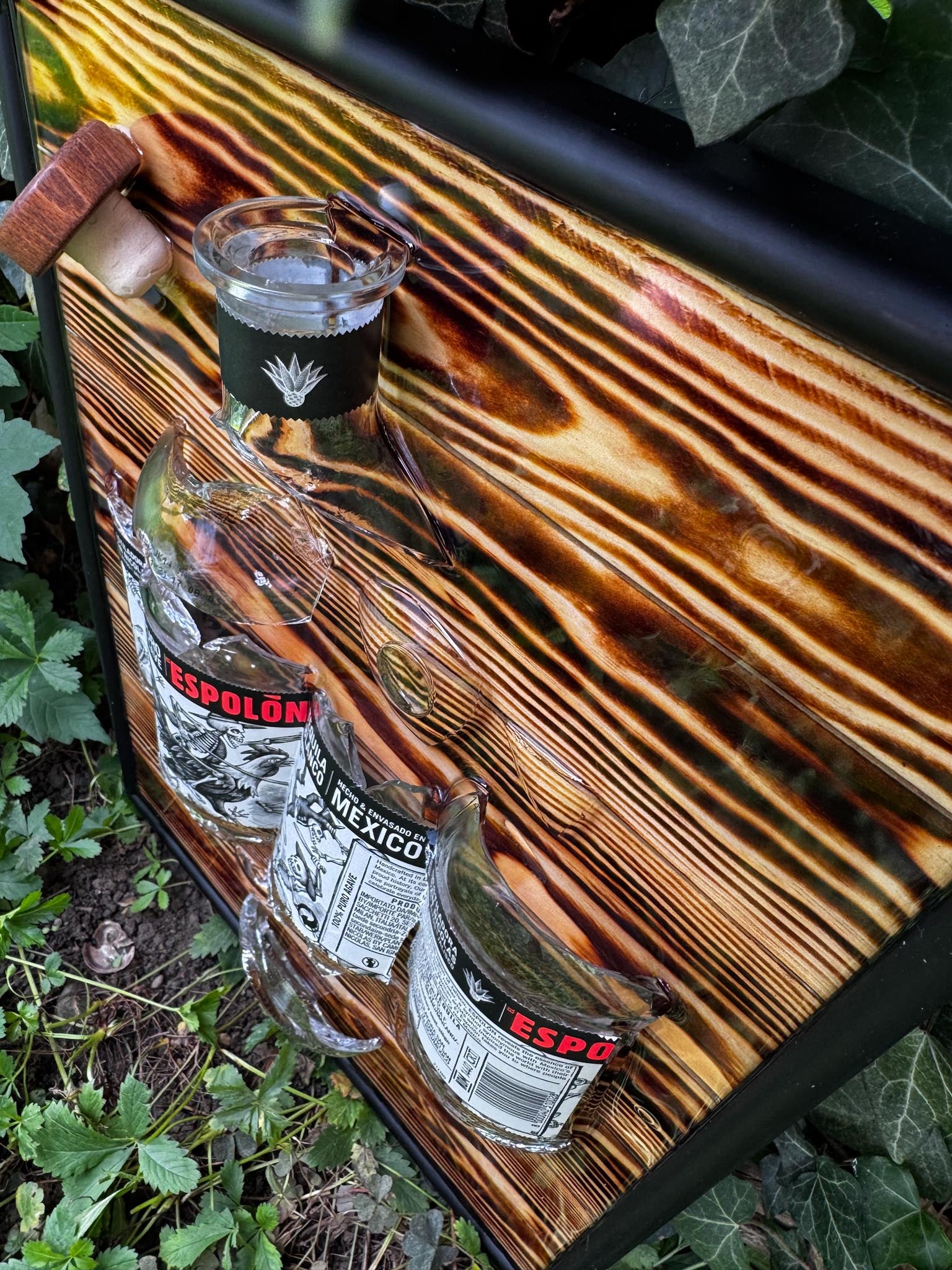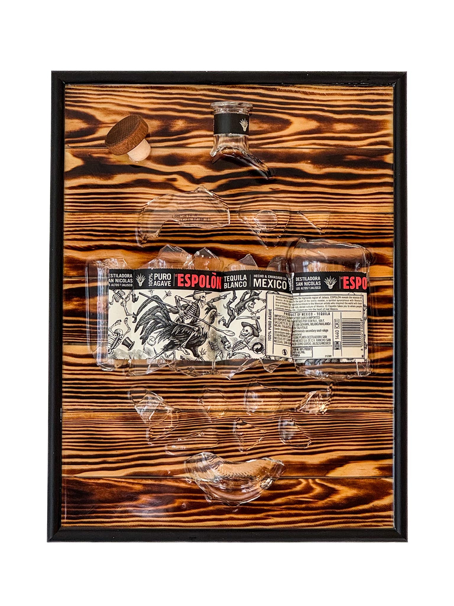 This exclusive 30×40 cm picture frame combines premium design with authentic heritage. The shards of an original Espolon Tequila bottle have been artistically arranged and permanently sealed in clear epoxy resin – a handcrafted one-of-a-kind piece for lovers of fine spirits and exceptional decor.