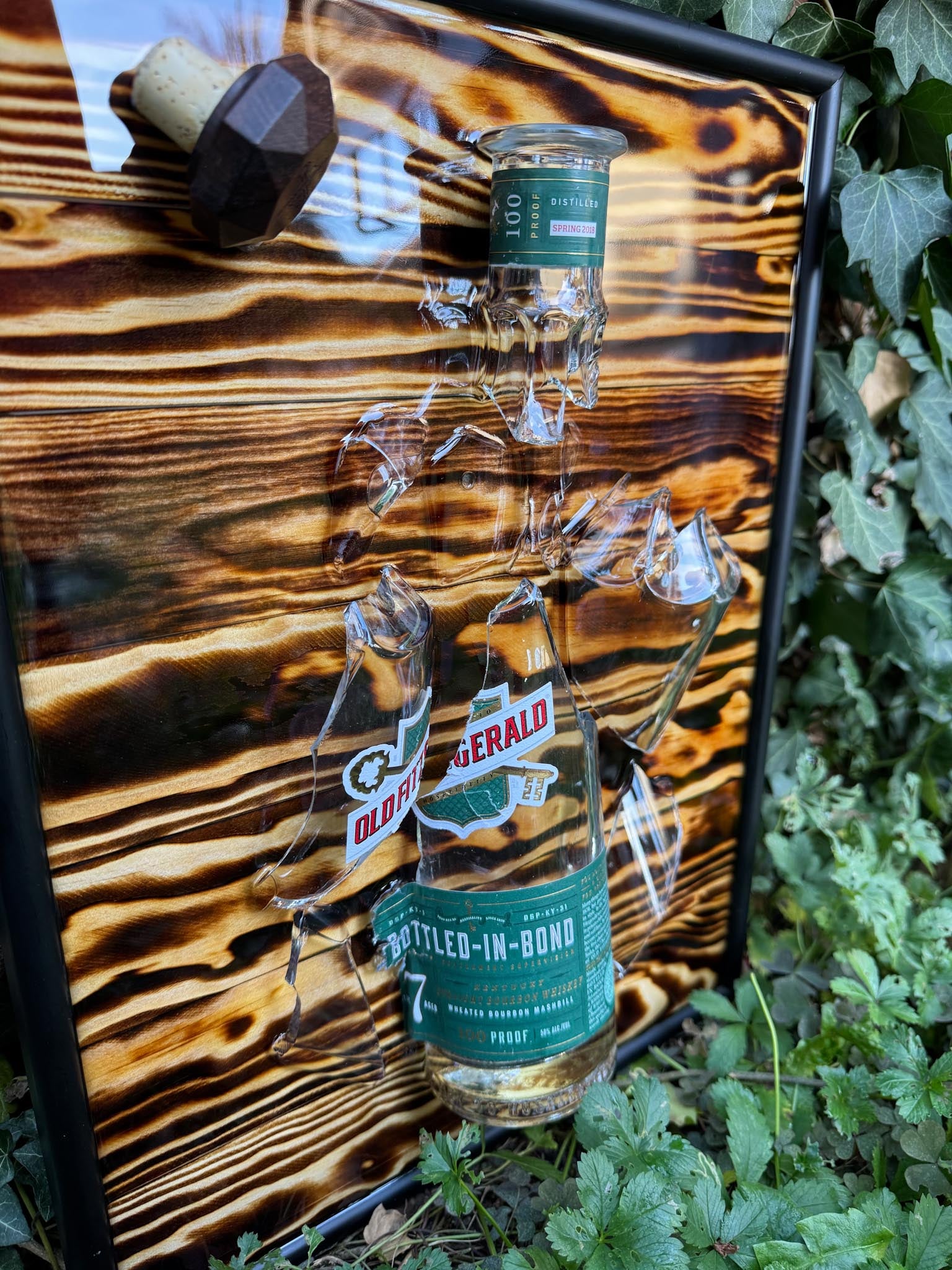Handcrafted broken bottle design picture frame approx. 30×40 cm – Old Fitzgerald 7 Year Bottled in Bond encased in epoxy resin.