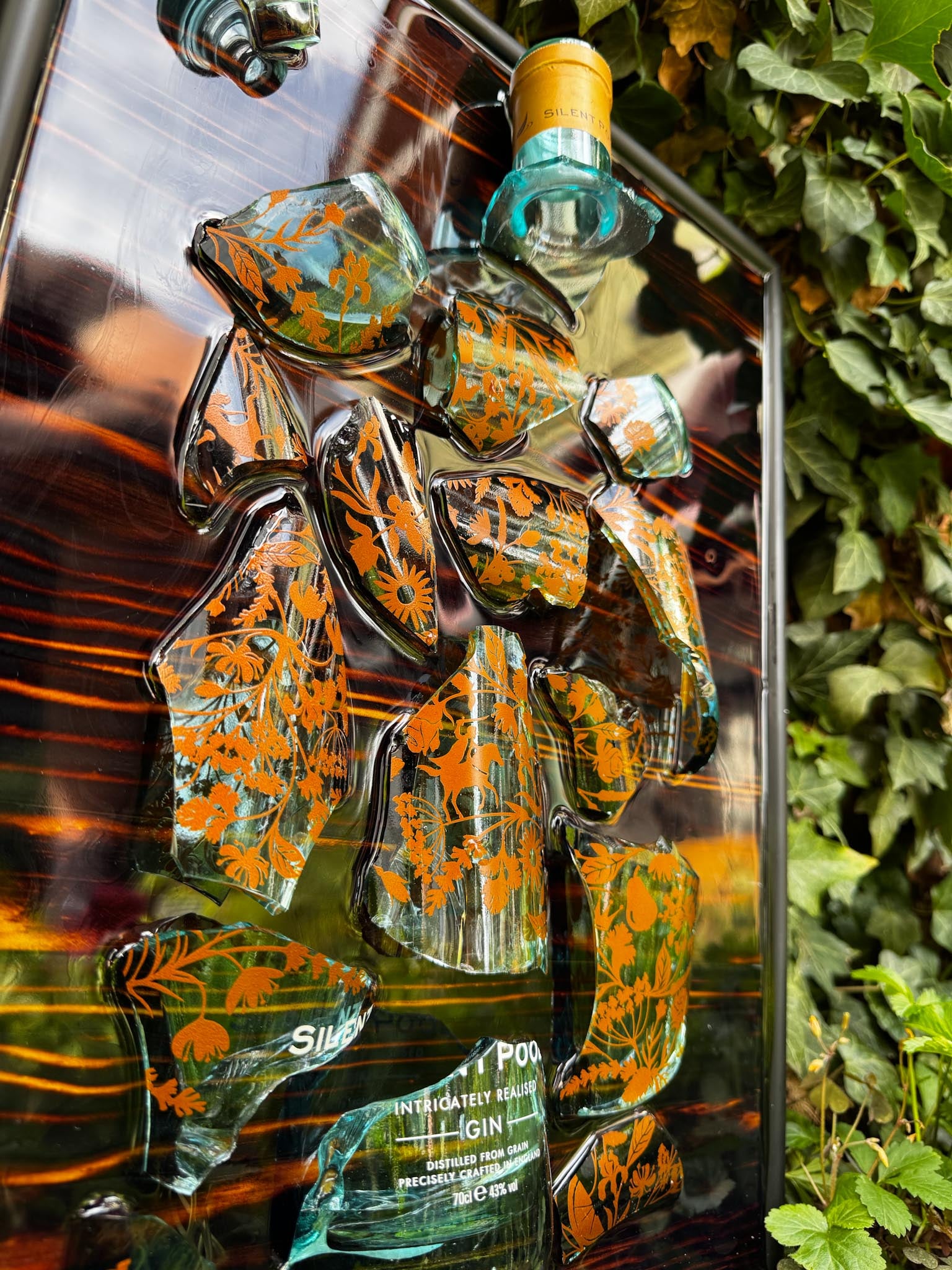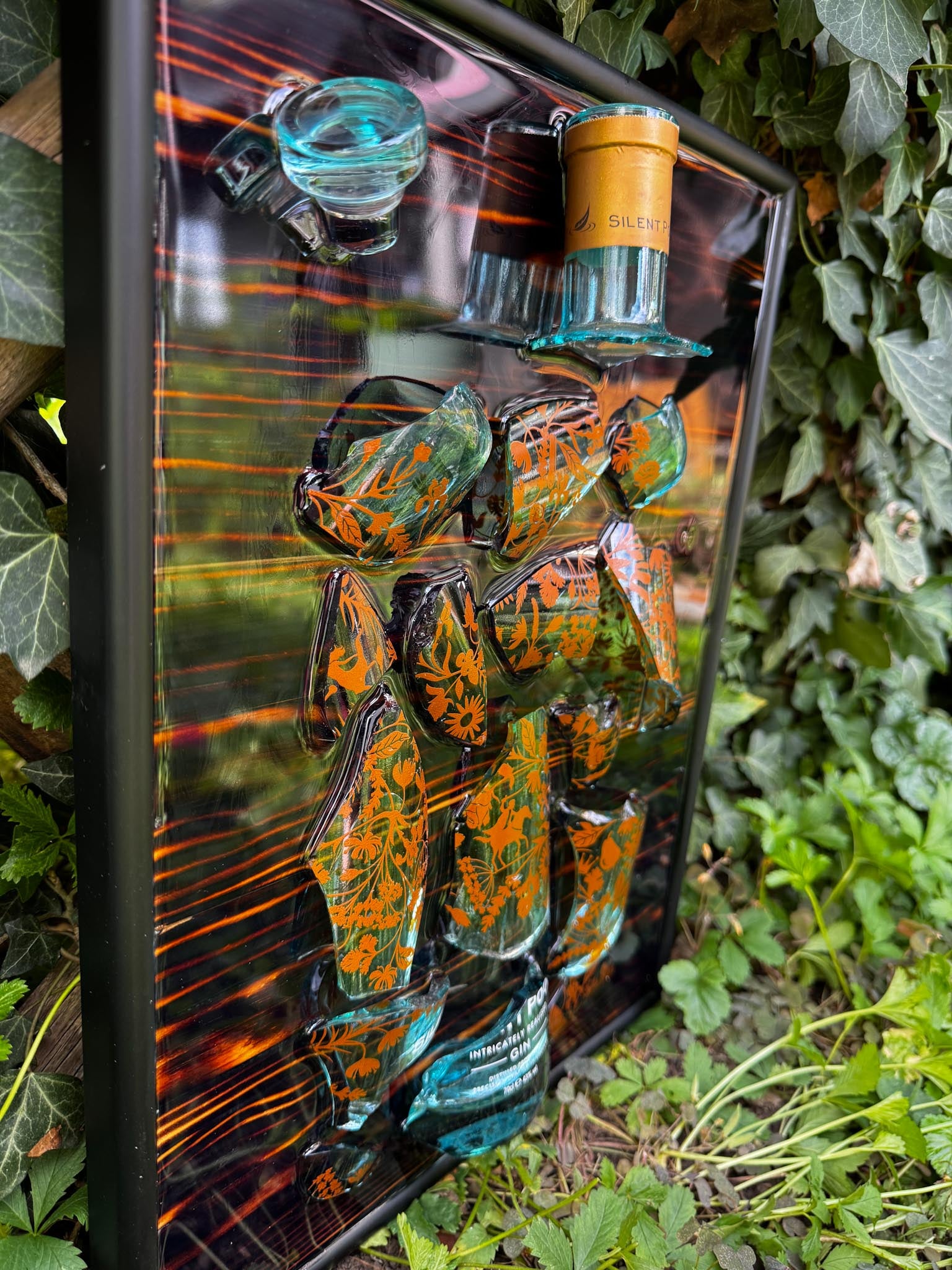 Handcrafted broken bottle design picture frame approx. 30×40 cm – Silent Pool Gin encased in epoxy resin.