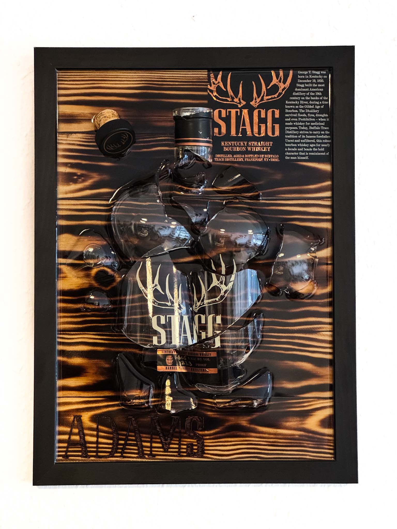 This exclusive picture frame combines premium design with authentic heritage. The shards of an original Stagg (Junior) Bourbon bottle have been artistically arranged and permanently sealed in clear epoxy resin – a handcrafted one-of-a-kind piece for lovers of fine spirits and exceptional decor.