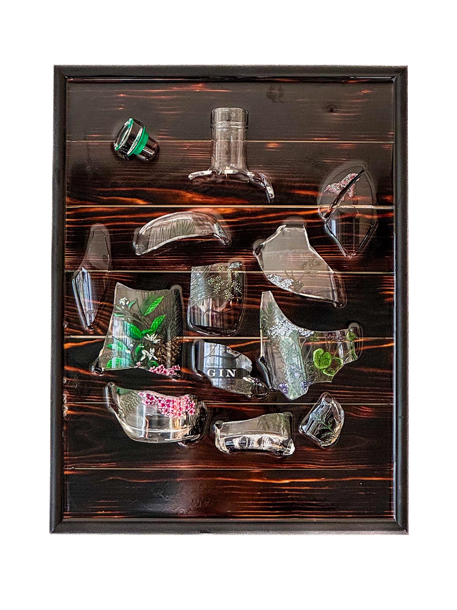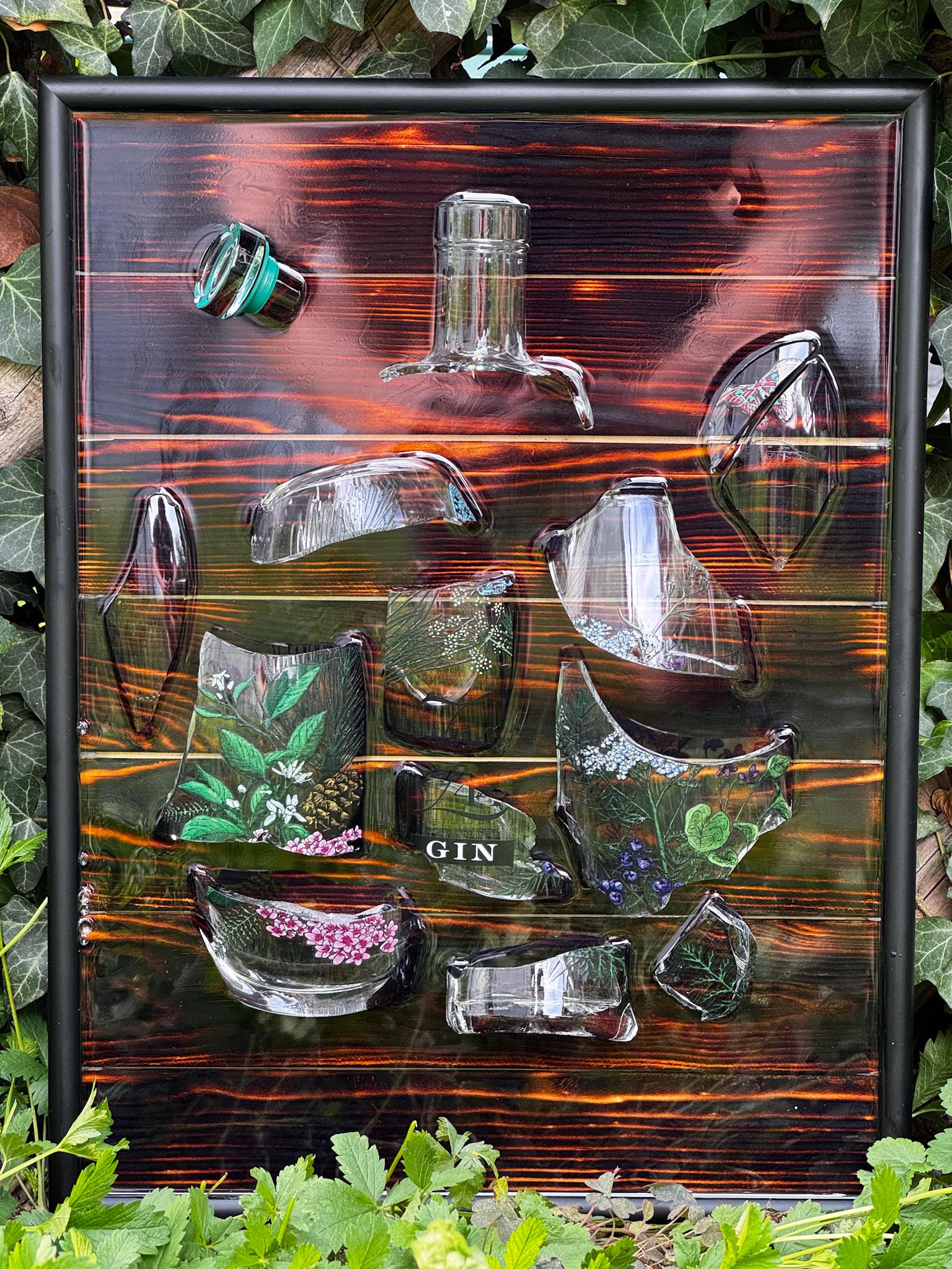Handcrafted broken bottle design picture frame approx. 30×40 cm – Z44 Gin encased in epoxy resin.